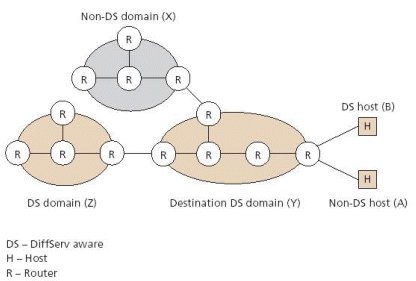 一個DiffServ Domain是由許多個提供DiffServ服務執行相同PHB且相連的 節點所組成,這些節點可分為edge router和core router。 如圖11.3,X domain為一沒有DiffServ功能的網域,Y 和 Z domain為各別的兩個 DiffServ網域, 兩者可能執行不同的PHB,對同類別的資料可有不同的標誌(DSCP)。 與其他網域連結的點統稱為edge router,此又分為Ingress和 Egress, 分別表示訊務進入網域和離開網域的節點,而沒有與其他domain相連接的節點稱為 core router。