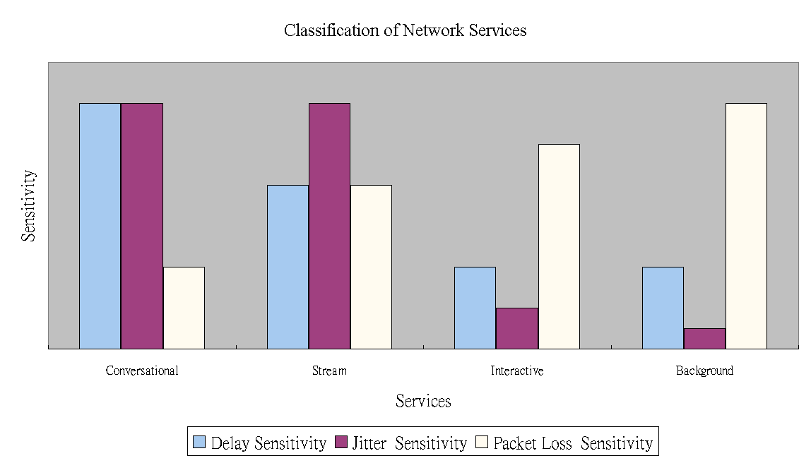 Conversational class services 主要用來支援人類的雙向溝通, 根據人類感官之經驗歸納,此種服務對 delay time 與 jitter 相當敏感,使用者在 delay time 超過 300 ms 時,就難以忍受 其通話品質(ITU-t G.114 標準對VoIP 的delay time 要求是150ms)。 相反的,對於 packet loss 則較可忍受。