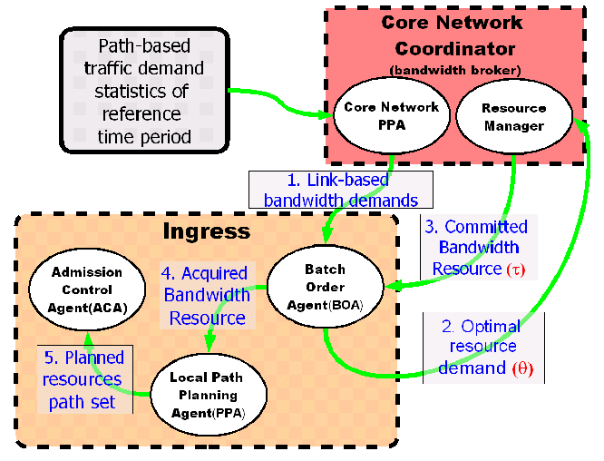 為了降低在訊務允入時執行call setup procedure所需的負擔,我們將資源保留的任務 分成兩階段執行。第一階段,預先規劃階段,核心網路管理元件根據需求之歷史 資料將所擁有之資源(所屬核心網路內之鏈路頻寬)分配到每個edge router, 每個edge router將所獲配之資源組成從edge router到其他edge router特定服務品質之 short-path。換言之,網路資源已經由鏈路資源改成更高階的short-path資源, 每個edge router在第一階段獲配short-path資源,以備於允入階段時使用。 此外每個網路營運者,必須收集所有核心網路所提供的short-path資訊, 為來自所屬接取網路進入的訊務規劃合乎品質需求的end-to-end path。 第二階段,允入階段,最前端的允入控制元件為提出允入需求的服務選擇 一條事先規劃好的end-to-end path,再根據組成該end-to-end path的short-path 逐一向各個核心網路要求保留,以便允入欲進入的訊務。由於實際上一個 訊務所經過的核心網路數屈指可數,在允入階段所耗費的管理負擔遠比RSVP協定少, 而且在事先規劃階段也可運用較佳的規劃工具獲得更有效率的資源運用。